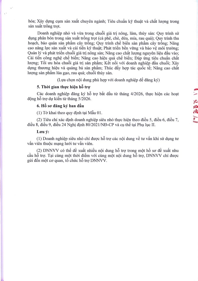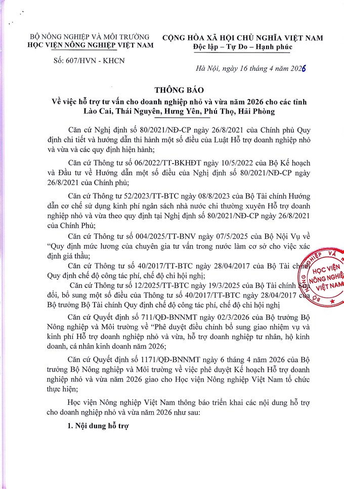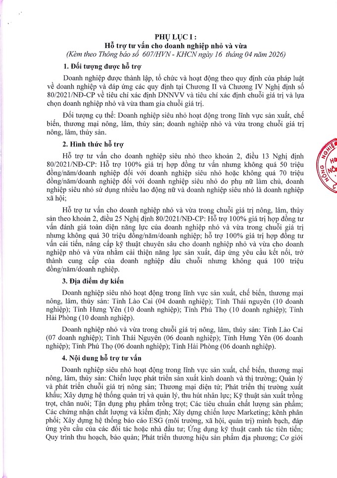 Thông báo về việc hỗ trợ tư vấn cho doanh nghiệp nhỏ và vừa năm 2026 cho các tỉnh Lào Cai, Thái Nguyên, Hưng Yên, Phú Thọ, Hải Phòng