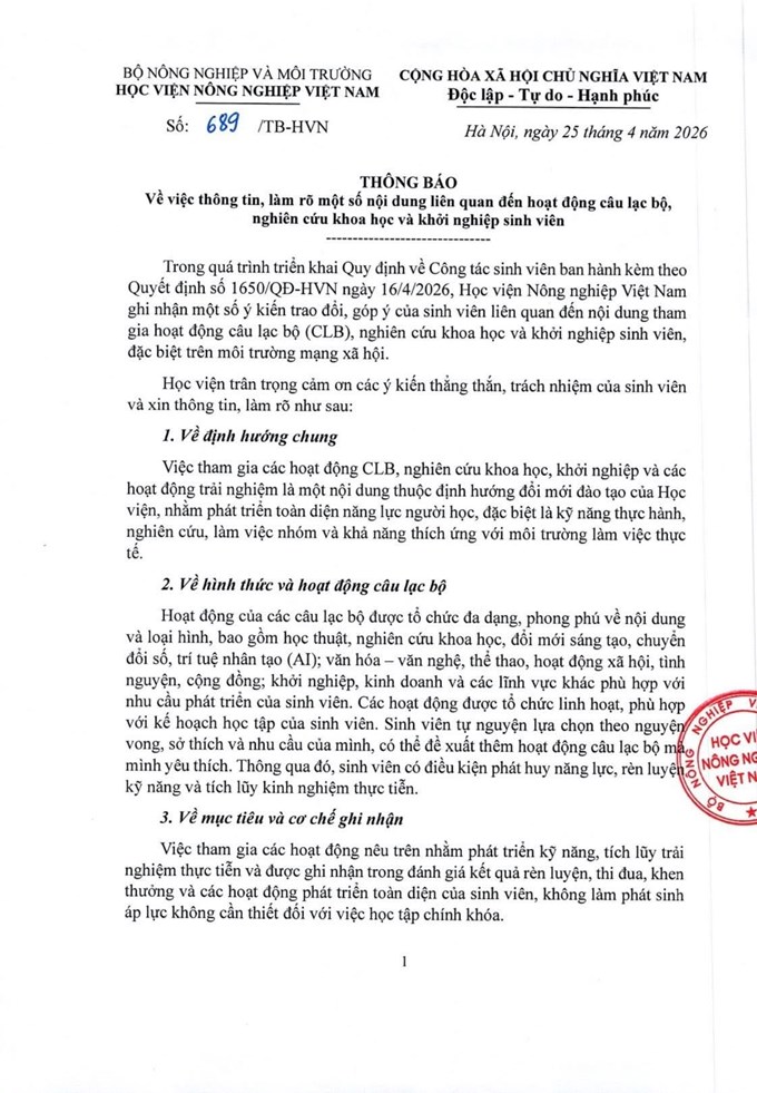 Thông báo về việc thông tin, làm rõ một số nội dung liên quan đến hoạt động câu lạc bộ, nghiên cứu khoa học và khởi nghiệp sinh viên