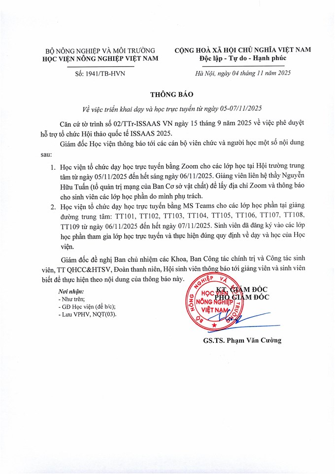 Thông báo về việc triển khai dạy và học trực tuyến ngày 05-07/11/2025