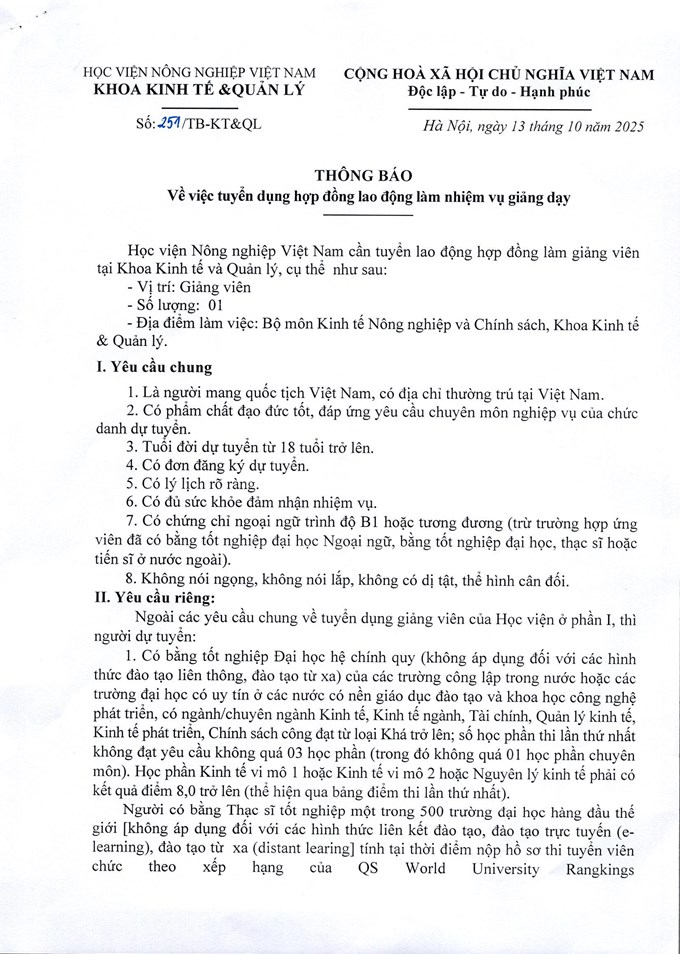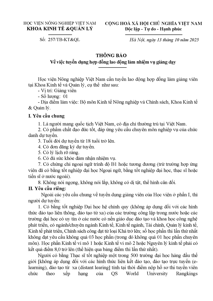 Tuyển dụng lao động hợp đồng làm giảng viên tại Khoa Kinh tế và Quản lý