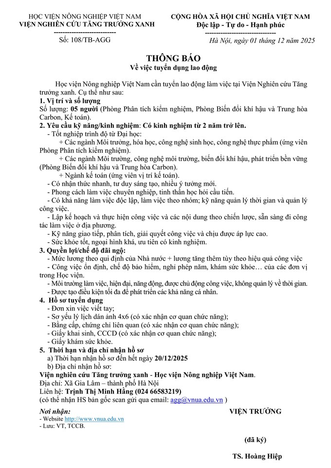 Tuyển lao động làm việc tại Viện Nghiên cứu Tăng trưởng xanh