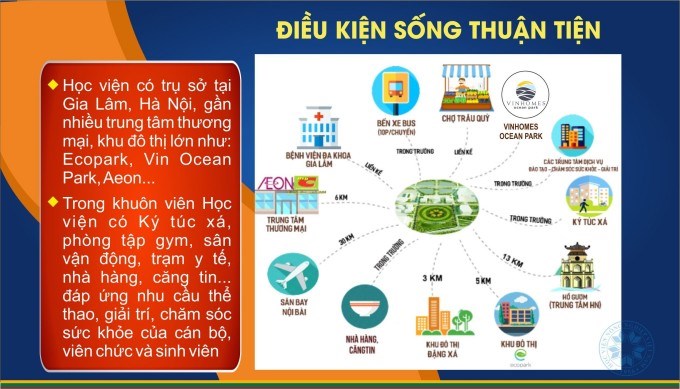 Học viện có khuôn viên rộng, xanh, sạch, đẹp nhất Thủ đô với diện tích gần 200ha và hệ thống cơ sở vật chất hiện đại, gồm: gần 170 phòng học thông minh, 52 phòng thí nghiệm (trong đó có 6 phòng thí nghiệm đạt tiêu chuẩn ISO), 82 mô hình khoa học công nghệ…; hệ thống thư viện của Học viện, khu liên hợp thể thao...đạt tiêu chuẩn chất lượng cao