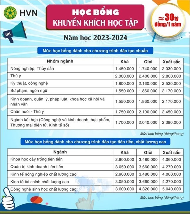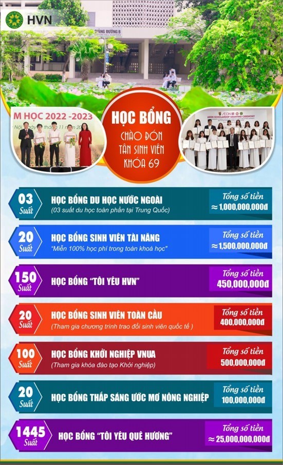 Năm 2024, Học viện dành gần 1.760 suất học bổng chào đón tân sinh viên khóa 69 với tổng giá trị khoảng 30 tỷ đồng gồm: học bổng du học nước ngoài, học bổng sinh viên tài năng, học bổng tôi yêu HVN, học bổng sinh viên toàn cầu, học bổng khởi nghiệp VNUA, học bổng thắp sáng ước mơ nông nghiệp, học bổng tôi yêu quê hương.