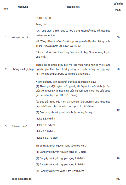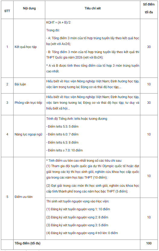 Quy trình xét học bổng gồm hai vòng. Ở vòng 1 (xét hồ sơ), thí sinh đã trúng tuyển và nhập học vào Học viện Nông nghiệp Việt Nam năm 2026 phải đáp ứng các tiêu chí: đạt học lực loại giỏi trong ít nhất 02 năm Trung học phổ thông hoặc có GPA từ mức A (hoặc tương đương) trở lên đối với thí sinh tốt nghiệp ở nước ngoài. Tổng điểm 03 môn thuộc tổ hợp trúng tuyển (theo kết quả học bạ và điểm thi tốt nghiệp Trung học phổ thông năm 2026) đạt từ 24 điểm trở lên; có chứng chỉ tiếng Anh quốc tế IELTS hoặc tương đương từ 5.5 trở lên và được ưu tiên nếu có chứng chỉ tiếng Trung.
