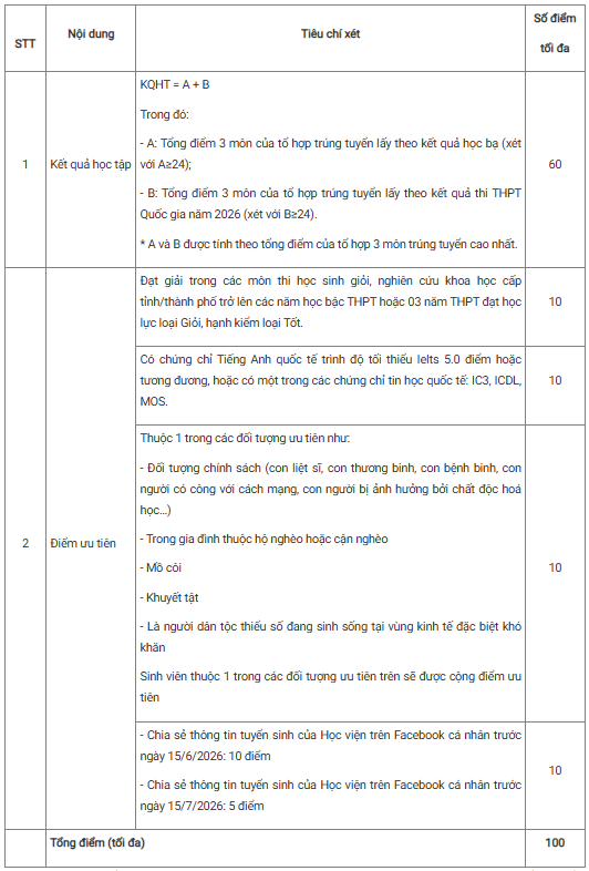 Quy trình xét học bổng gồm hai vòng. Ở vòng 1 (xét hồ sơ), thí sinh đã trúng tuyển và nhập học vào Học viện năm 2026 cần đáp ứng các tiêu chí: cả 03 năm Trung học phổ thông đạt học lực loại Giỏi, hạnh kiểm loại Tốt hoặc có GPA từ mức A (hoặc tương đương) trở lên đối với thí sinh tốt nghiệp Trung học phổ thông ở nước ngoài; tổng điểm 03 môn thuộc tổ hợp trúng tuyển (theo kết quả học bạ và điểm thi tốt nghiệp Trung học phổ thông năm 2026) đạt từ 25 điểm trở lên; có chứng chỉ tiếng Anh quốc tế IELTS hoặc tương đương từ 6.0 trở lên.