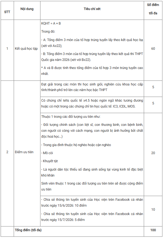 Học bổng dành cho các thí sinh đã hoàn tất thủ tục nhập học vào Học viện năm 2026 và được xét chọn căn cứ trên các tiêu chí theo quy định, bao gồm: