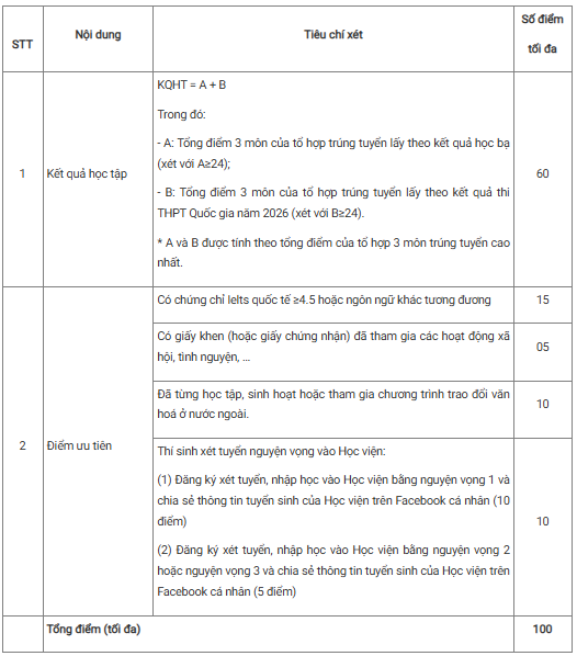 Việc xét tuyển căn cứ vào tổng điểm xét tuyển vào Học viện, điểm bài luận và phỏng vấn. Đồng thời ưu tiên học sinh thuộc diện chính sách, đăng ký ngành địa phương có nhu cầu cao và có năng lực ngoại ngữ, tin học tốt.