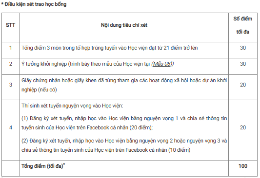 Lưu ý, thí sinh đạt học bổng sẽ được Học viện lựa chọn theo thứ tự từ cao xuống thấp và phải đạt tối thiểu 70 điểm trở lên trong tổng điểm trên. Đồng thời, thí sinh đạt học bổng sẽ thực hiện cam kết hoàn trả lại số tiền học bổng trên nếu xin thôi học tại Học viện.