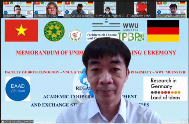 Đẩy mạnh hợp tác Quốc tế nhằm mục đích tăng cường, nâng cao chất lượng đào tạo đồng thời giúp lan tỏa tri thức và các giá trị giáo dục toàn diện đến người học, ngày 22/03/2022, khoa Công nghệ sinh học (FoB), Học viện Nông nghiệp Việt Nam đã chính thức ký kết Biên bản ghi nhớ hớp tác (MoU) với Khoa Hóa dược (FCB), Viện Sinh học dược phẩm và Hóa thực vật Muenster, Đức (WWU). Trong bối cảnh tình hình dịch Covid-19 diễn biễn phức tạp, lễ ký kết được diễn ra theo hình thức trực tuyến.