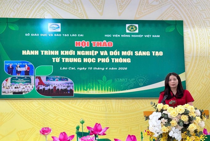 Phát biểu khai mạc Hội thảo, bà Nguyễn Thu Hương - Phó Giám đốc Sở Giáo dục và Đào tạo tỉnh Lào Cai cho biết, Hội thảo là một trong những hoạt động hợp tác giữa Học viện Nông nghiệp Việt Nam và Sở Giáo dục và Đào tạo với sự tham gia của các diễn giả giàu kinh nghiệm về giáo dục, khởi nghiệp. Hội thảo được tổ chức nhằm trang bị kiến thức, kỹ năng khởi nghiệp cho học sinh THPT; khơi dậy tinh thần, khát vọng khởi nghiệp trong giới trẻ theo tinh thần Nghị quyết số 57/NQ-TW ngày 22/12/2024 của Bộ Chính trị về đột phá phát triển khoa học công nghệ, đổi mới sáng tạo và chuyển đổi số quốc gia, Quyết định số 336/QĐ-TTg ngày 25/02/2026 của Thủ tướng Chính phủ về việc phê duyệt chương trình “Hỗ trợ học sinh, sinh viên khởi nghiệp giai đoạn 2026-2035”.