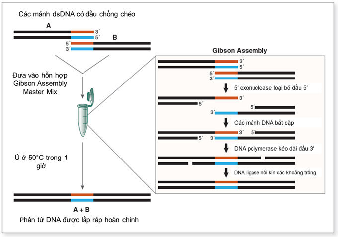 Gibson Assembly hoạt động dựa trên sự phối hợp của ba enzyme chính: 5' exonuclease, DNA polymerase và DNA ligase (Hình 1) (Gibson & cs., 2009). Quy trình diễn ra ở nhiệt độ ổn định 50°C trong khoảng 15-60 phút. Đầu tiên, exonuclease loại bỏ nucleotide từ đầu 5' của các đoạn DNA, tạo ra các đầu nhô ra đơn sợi (overhangs) tại vùng chồng chéo (thường 20-40 bp). Các đầu này sau đó bắt cặp với nhau, polymerase giúp lấp đầy khoảng trống, và ligase nối kín các khoảng trống đó, hình thành phân tử DNA liền mạch. Phương pháp này vượt trội so với kỹ thuật enzyme cắt giới hạn truyền thống, vốn thường để lại "sẹo" trình tự và yêu cầu điều kiện nghiêm ngặt, dễ bị ảnh hưởng bởi methyl hóa DNA hoặc hoạt tính ngoài mục tiêu.