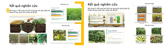 Từ kết quả điều tra, phân tích đất và các mô hình thực nghiệm, nhiệm vụ đã đề xuất gói giải pháp kỹ thuật tổng hợp, bao gồm: tăng cường sử dụng phân hữu cơ; che phủ đất bằng phụ phẩm nông nghiệp đã qua xử lý bằng chế phẩm vi sinh; xen canh cây họ đậu; kết hợp tưới nước tiết kiệm và bón phân khoáng cân đối. Các biện pháp này không chỉ giúp nâng cao khả năng giữ ẩm và cải thiện độ phì đất mà còn góp phần cải thiện cấu trúc đất, tăng hàm lượng chất hữu cơ và phục hồi hoạt tính vi sinh vật đất – những yếu tố then chốt quyết định tính bền vững của hệ thống canh tác trong điều kiện khô hạn kéo dài.