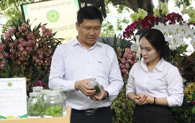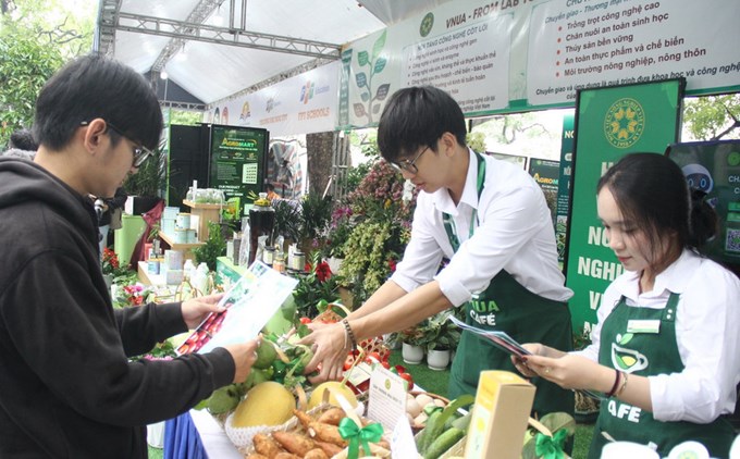 | Sinh viên Học viện Nông nghiệp Việt Nam giới thiệu sản phẩm do chính cán bộ, giảng viên, người học nghiên cứu, lai tạo và sản xuất thành công. |