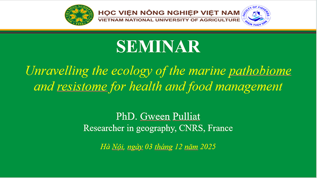 Nhằm nâng cao nhận thức và chia sẻ các kiến thức, kinh nghiệm về vấn đề này, sáng ngày 03/12/2025, nhóm nghiên cứu mạnh Bệnh Thủy sản đã phối hợp cùng các chuyên gia từ CNRS, France tổ chức seminar với chủ đề “Giải mã hệ sinh thái của vi sinh vật gây bệnh và hệ vi sinh vật kháng thuốc trong nuôi trồng thủy sản biển Khánh Hòa”. Buổi chia sẻ thu hút sự tham gia của giảng viên, sinh viên và chuyên gia trong lĩnh vực thủy sản.