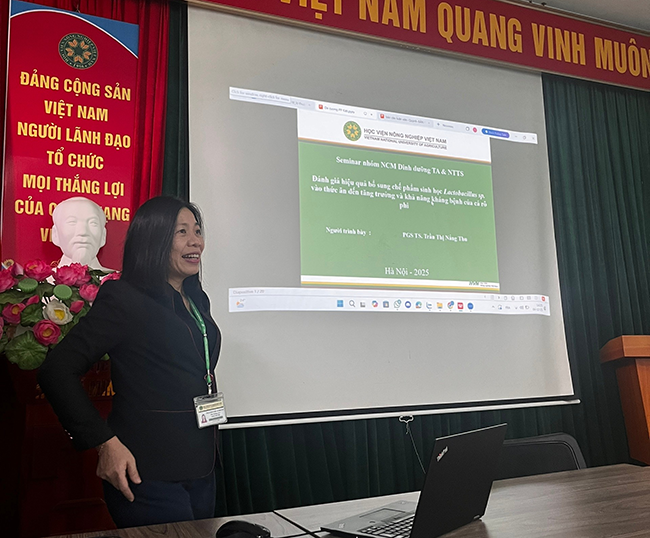 Buổi seminar đã thu hút nhiều ý kiến trao đổi, thảo luận khoa học từ các đại biểu tham dự, xoay quanh việc tối ưu hóa liều lượng, thời gian bổ sung và khả năng mở rộng ứng dụng trong điều kiện sản xuất thực tế. Thông qua hai báo cáo chuyên sâu, seminar tiếp tục khẳng định vai trò của Nhóm nghiên cứu mạnh Dinh dưỡng thức ăn và Nuôi trồng thủy sản trong việc thúc đẩy nghiên cứu ứng dụng, góp phần phát triển ngành thủy sản theo hướng sinh học, an toàn và bền vững.