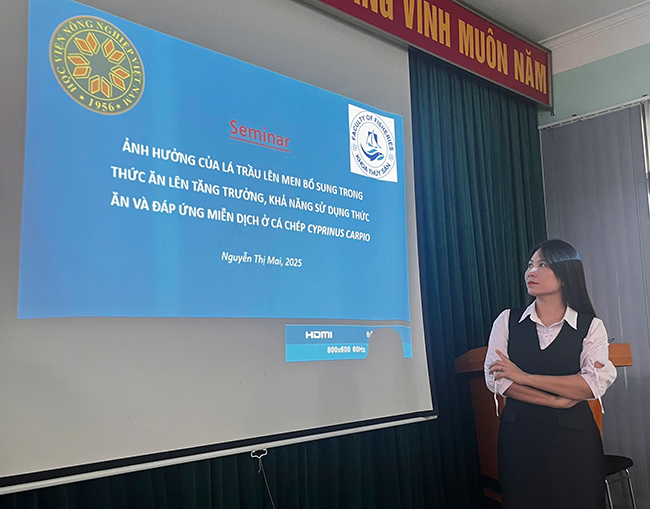Bài trình bày thứ nhất với tiêu đề “Ảnh hưởng của lá trầu lên men bổ sung trong thức ăn lên tăng trưởng, khả năng sử dụng thức ăn và đáp ứng miễn dịch ở cá chép (Cyprinus carpio)” do PGS.TS. Nguyễn Thị Mai trình bày. Báo cáo đã giới thiệu cơ sở khoa học và thực tiễn của việc sử dụng lá trầu (Piper betle) – một loài thảo dược giàu hoạt chất sinh học – sau quá trình lên men nhằm khắc phục các hạn chế của thảo dược thô khi sử dụng trực tiếp trong thức ăn thủy sản. Kết quả nghiên cứu cho thấy, việc bổ sung lá trầu lên men ở mức phù hợp giúp cải thiện tốc độ tăng trưởng, nâng cao hiệu quả sử dụng thức ăn, đồng thời kích thích đáp ứng miễn dịch không đặc hiệu của cá chép thông qua một số chỉ tiêu sinh lý – miễn dịch. Báo cáo cũng nhấn mạnh vai trò của quá trình lên men trong việc làm tăng khả năng hấp thu, giảm các yếu tố bất lợi đối với hệ tiêu hóa, từ đó góp phần nâng cao sức khỏe tổng thể của cá nuôi.