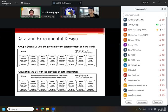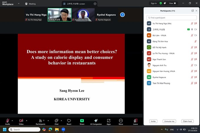 Ngày 27/10/2025, nhóm nghiên cứu mạnh Kinh doanh, Thương mại và Phát triển bền vững, Khoa Kế toán và Quản trị kinh doanh đã mời GS.TS. Sang-Hyeon Lee – Giảng viên Khoa Kinh tế nguồn lực và Thực phẩm, Trường Đại học Hàn Quốc, Hàn Quốc trình bày nghiên cứu với chủ đề “Cung cấp nhiều thông tin sẽ có sự lựa chọn tốt hơn? Nghiên cứu thành phần dinh dưỡng và hành vi người tiêu dùng tại các nhà hàng - Does more information mean better choices? A study on calorie display and consumer behavior in restaurants”. Mục đích của seminar là thúc đẩy hợp tác, trao đổi nghiên cứu về hành vi và quyết định tiêu dùng thực phẩm giữa giảng viên của Học viện Nông nghiệp Việt Nam và Trường Đại học Hàn Quốc. Seminar có sự tham dự của các cán bộ, giảng viên và sinh viên Khoa Kế toán và Quản trị kinh doanh và Khoa Tài nguyên và Môi trường, Học viện Nông nghiệp Việt Nam. Đồng thời, seminar có sự tham dự của PGS.TS. Ryohei Kageura – Phó Giám đốc Trung tâm Nghiên cứu bền vững, Trường Đại học Thương mại Chiba, Nhật Bản. Seminar được tổ chức online qua ứng dụng Zoom.