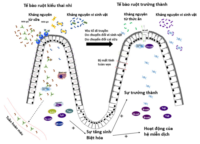 Sơ đồ minh họa những thay đổi trưởng thành diễn ra trong ruột non, với sự thay thế các tế bào biểu mô thai nhi loại nội bào bằng các tế bào trưởng thành trưởng thành trong quá trình phát triển thai nhi/trẻ sơ sinh của động vật có vú non (Weström et al., 2020) |