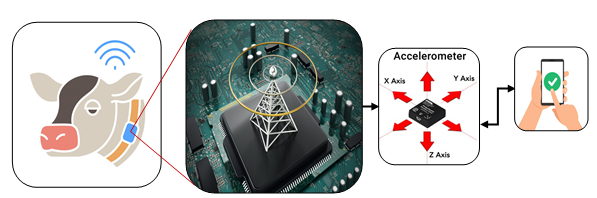Trong nghiên cứu (Dang, N.H. & cs., 2023) đã đề xuất một hệ thống tự cấp nguồn để phân loại các hành vi khác nhau của bò sữa dựa trên dữ liệu gia tốc, nhằm cung cấp một giải pháp mới và hiệu quả cho việc giám sát hành vi bò sữa (Hình 4). Hệ thống sử dụng một thẻ cảm biến gắn trên cổ bò, được tích hợp với cảm biến gia tốc, để ghi nhận dữ liệu hành vi. Đặc biệt, thẻ cảm biến này vận hành hoàn toàn không cần pin. Năng lượng cần thiết được thu hoạch từ sóng vô tuyến (RF) trong dải tần siêu cao (UHF) ở 915 MHz, được phát ra từ một đầu đọc cho phép vận hành ổn định trong các môi trường chăn nuôi không có nguồn cấp điện trực tiếp.
