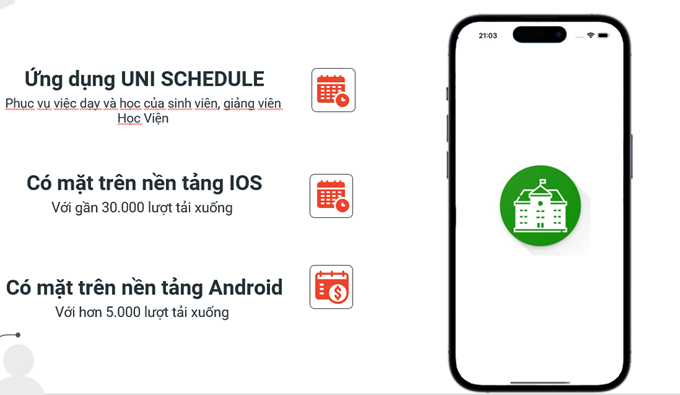 Đề tài: “Xây dựng ứng dụng di động tra cứu thông tin phục vụ hoạt động đào tạo dành cho sinh viên và giảng viên Học viện Nông nghiệp Việt Nam” được thực hiện bởi nhóm sinh viên: Vũ Văn Hoàng (K66CNPMA), Dương Văn Duy (K66TTNTA), Trần Thị Thảo (K66TTNTA). Trong khuôn khổ của đề tài, nhóm nghiên cứu đã thực hiện một quá trình khảo sát, phân tích các hệ thống hiện có, từ đó đề xuất và xây dựng một giải pháp công nghệ ứng dụng di động mới có tên UNI SCHEDULE nhằm phục vụ tốt hơn nhu cầu tra cứu thông tin của sinh viên, giảng viên và phụ huynh trong môi trường giáo dục hiện đại tại Học viện Nông nghiệp Việt Nam. Kết quả đề tài đã tạo đã góp phần thúc đẩy chuyển đổi số trong lĩnh vực giáo dục và nâng cao chất lượng dịch vụ hỗ trợ sinh viên.