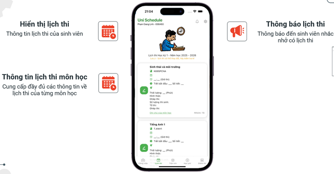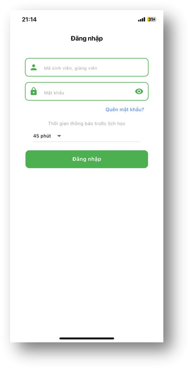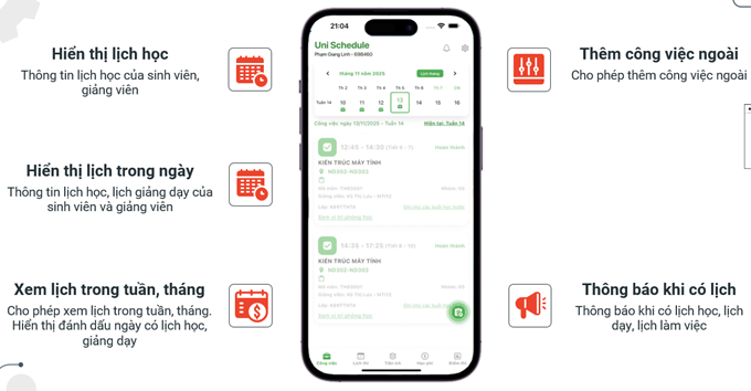 Giao diện của ứng dụng đã được thiết kế tối ưu, đơn giản, trực quan, phù hợp với thói quen sử dụng của sinh viên, giúp họ dễ dàng thao tác và tra cứu thông tin một cách nhanh chóng. Các bảng chức năng được sắp xếp hợp lý, dễ truy cập, giúp sinh viên chủ động trong việc quản lý thời gian và chuẩn bị cho các hoạt động học tập. Đặc biệt, hệ thống còn cung cấp tính năng thông báo đẩy (push notification), giúp truyền tải các tin tức, thông báo quan trọng từ nhà trường một cách kịp thời.