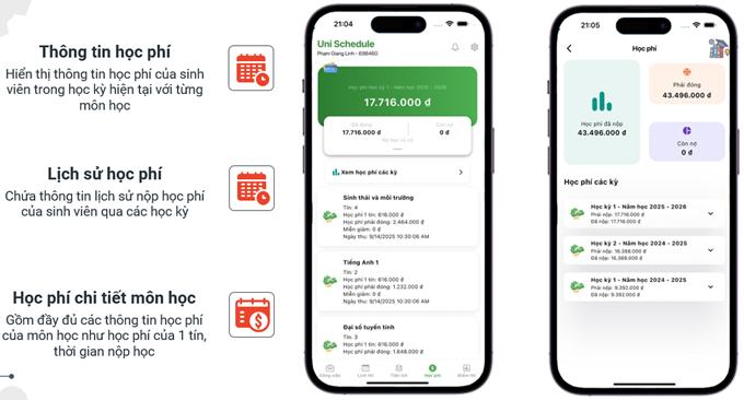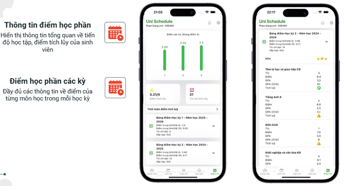 Trong quá trình xây dựng, hệ quản trị cơ sở dữ liệu SQLite được tích hợp để phục vụ các chức năng offline, giúp sinh viên có thể tra cứu thông tin ngay cả khi không có kết nối internet, đồng thời giảm tải cho hệ thống API và tăng tốc độ phản hồi. Các chức năng chính của hệ thống đã được phát triển, thử nghiệm và hoàn thiện, bao gồm: đăng nhập và xác thực tài khoản sinh viên, hiển thị thông tin cá nhân, tra cứu lịch học, lịch thi, điểm số, học phí, thông báo, và các tiện ích bổ sung như xem vị trí phòng học qua bản đồ, ghi chú các buổi học, theo dõi tiến độ tích lũy điểm và tín chỉ.