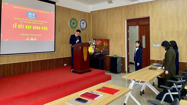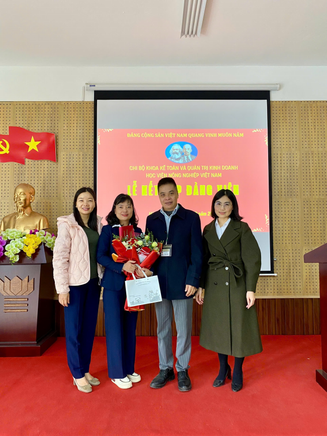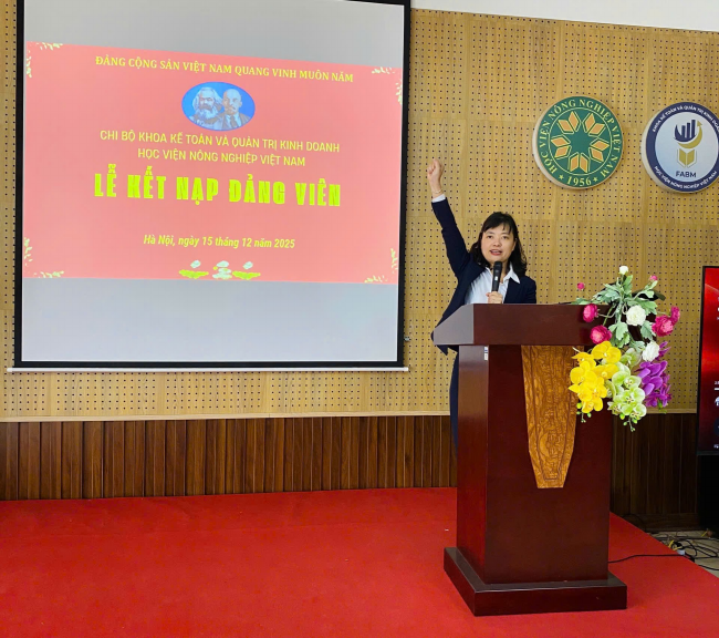 Chi bộ Khoa Kế toán và Quản trị kinh doanh xác định công tác bồi dưỡng và kết nạp đảng viên mới là nhiệm vụ thường xuyên, có vai trò hết sức quan trọng trong xây dựng Đảng, góp phần củng cố, phát triển và nâng cao chất lượng cũng như sức chiến đấu của tổ chức cơ sở Đảng và đội ngũ đảng viên. Với ý nghĩa quan trọng đó, thực hiện Điều lệ Đảng Cộng sản Việt Nam và căn cứ Quyết định của Đảng ủy Học viện Nông nghiệp Việt Nam, ngày 15/12/2025, Chi bộ Khoa Kế toán và Quản trị kinh doanh đã long trọng tổ chức “Lễ kết nạp Đảng viên” cho quần chúng ưu tú Lê Thanh Hà. Tham dự Lễ kết nạp có đồng chí Nguyễn Anh Trụ - Bí thư Chi bộ, Phó Trưởng Khoa Kế toán và Quản trị kinh doanh và toàn thể đảng viên trong Chi bộ. Đồng thời, chương trình có sự tham dự của đồng chí Chủ tịch Công đoàn Khoa và Bí thư Liên chi đoàn Khoa Kế toán và Quản trị kinh doanh.
