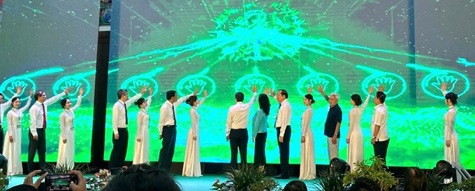 | Lãnh đạo Học viện Nông nghiệp Việt Nam cùng các vị đại biểu bấm nút ra mắt sàn đấu giá hoa, cây cảnh Học viện Nông nghiệp Việt Nam. |