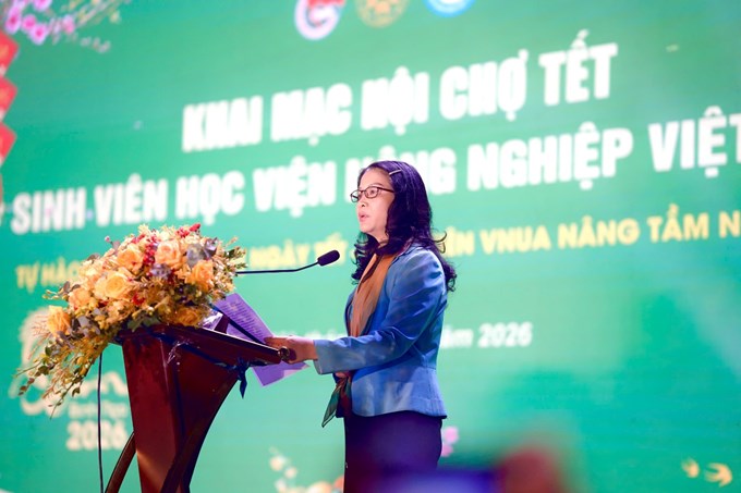 | -GS.TS.NGƯT. Nguyễn Thị Lan - Đại biểu Quốc hội, Bí thư Đảng ủy, Giám đốc Học viện phát biểu tại chương trình khai mạc Hội chợ Tết sinh viên năm 2026 |