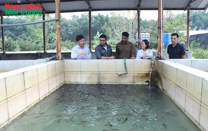 | PGS, TS. Kim Văn Vạn trao đổi cùng nhóm sinh viên quốc tế tại khu thực nghiệm nuôi trồng thủy sản của Học viện Nông nghiệp Việt Nam |
