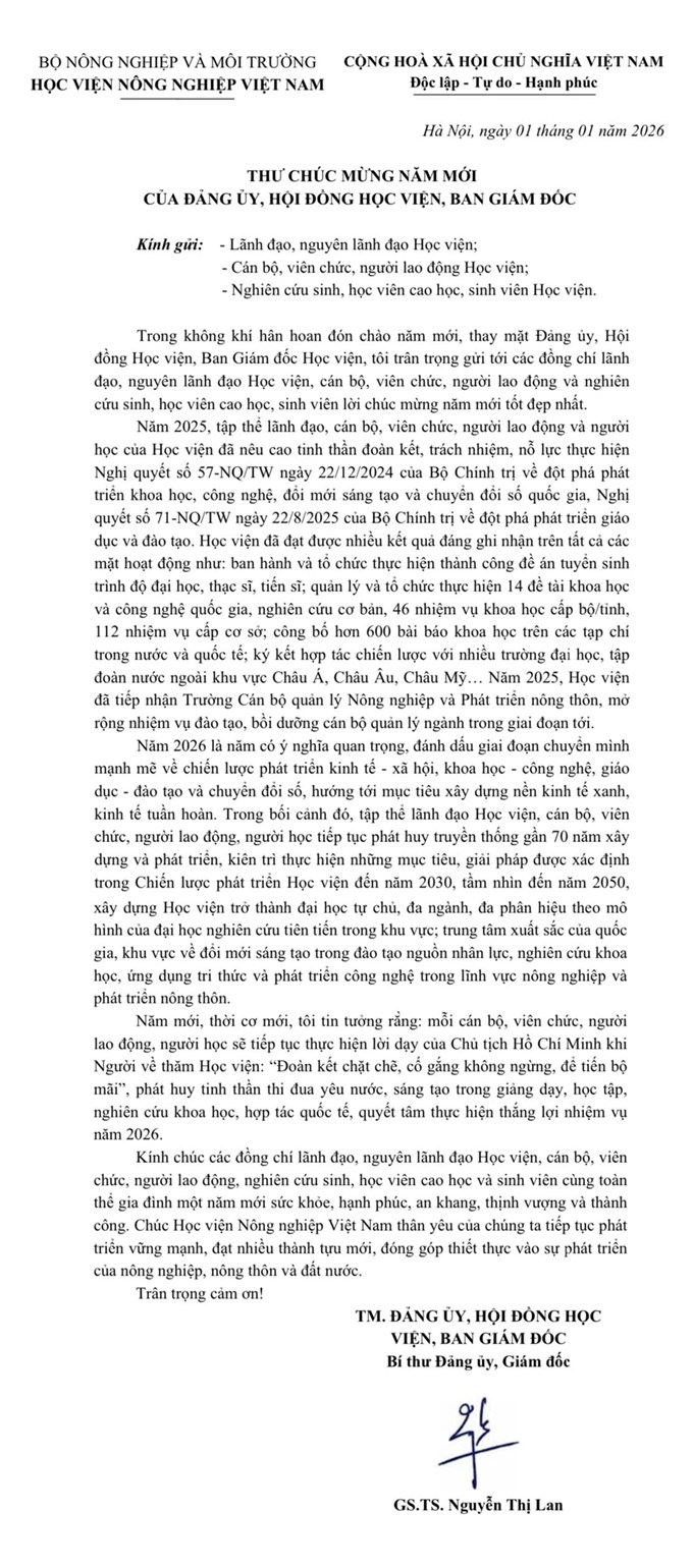 Thư chúc mừng năm mới của Đảng ủy, Hội đồng Học viện, Ban Giám đốc