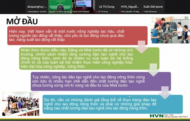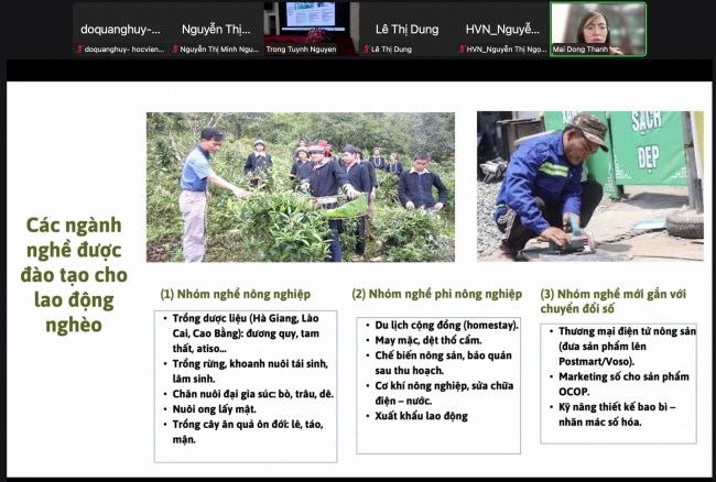 Tại mỗi buổi tọa đàm, các báo cáo viên đã trình bày tham luận dưới hình trực tiếp hoặc trực tuyến trên nền tảng Zoom Meetings về đào tạo nghề nông nghiệp cho lao động thuộc hộ nghèo, hộ cận nghèo, hộ mới thoát nghèo và người lao động có thu nhập thấp. Tại Tọa đàm, các vị diễn giả và người lao động cũng đã thảo luận, trao đổi, tìm kiếm giải pháp thúc đẩy hoạt động dạy và học nghề nông nghiệp cho lao động thuộc hộ nghèo, hộ cận nghèo, hộ mới thoát nghèo và người lao động có thu nhập thấp, từ đó tìm kiếm giải pháp trong việc nâng cao chất lượng, hiệu quả công tác đào tạo nghề cho lao động nông thôn, nâng cao tỷ lệ lao động có việc làm sau đào tạo.