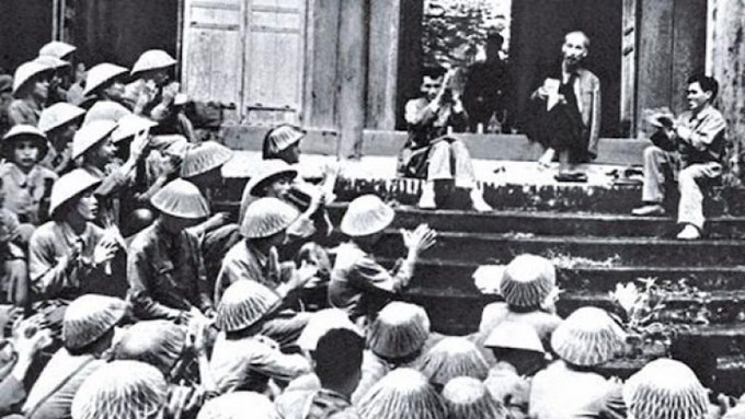 | Bác Hồ gặp gỡ, nói chuyện với cán bộ, chiến sĩ Đại đoàn Quân Tiên phong tại Đền Giếng (Ảnh tư liệu) |