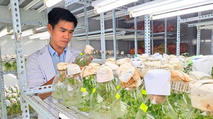 | Thạc sĩ Vũ Tiến Dũng tại phòng nuôi cấy mô của Viện Sinh học và Công nghệ nông nghiệp Việt Nam. Ảnh: Bảo Ngọc. |