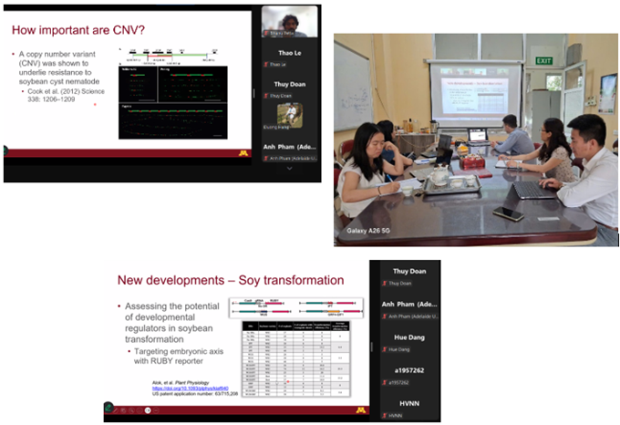 Trong buổi trao đổi, GS. Bob Stupar giới thiệu về chương trình nghiên cứu của nhóm ông tại Đại học Minnesota. Các hướng nghiên cứu chính bao gồm thành phần hạt đậu tương, kiến trúc cây, khả năng chống chịu bất thuận phi sinh học, chọn giống và di truyền đậu Hà Lan, các phương pháp công nghệ sinh học thực vật, phát hiện gen và chọn giống, cũng như ứng dụng chỉnh sửa gen để tạo ra các sản phẩm mới. Những nội dung này cho thấy cách tiếp cận liên ngành, kết hợp giữa di truyền học cổ điển, hệ gen học hiện đại và công nghệ sinh học trong cải tiến cây trồng.