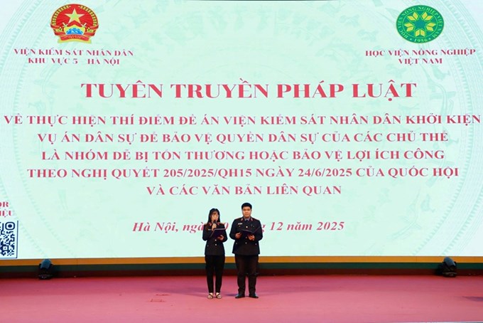 Chiều 20/12, VKSND khu vực 5 - Hà Nội phối hợp với Học viện Nông nghiệp Việt Nam tổ chức Hội nghị tuyên truyền Nghị quyết 205/2025/QH15 của Quốc hội. Hội nghị nhằm làm rõ ý nghĩa, nội dung thí điểm trao quyền cho Viện kiểm sát khởi kiện vụ án dân sự, qua đó nâng cao nhận thức pháp luật, bảo vệ hiệu quả quyền dân sự và lợi ích công.