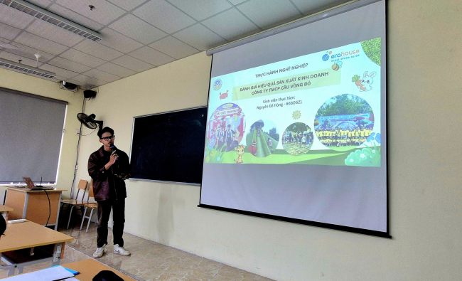 | Sinh viên trình bày tóm tắt báo cáo thực hành nghề nghiệp tại công ty cung cấp dịch vụ giáo dục trải nghiệm |