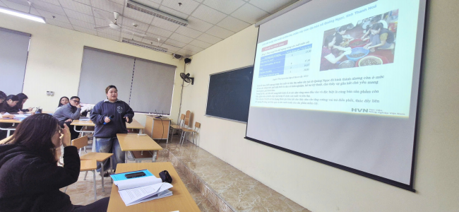 | Sinh viên trình bày tóm tắt báo cáo thực hành nghề nghiệp về làng nghề làm mắm cáy |