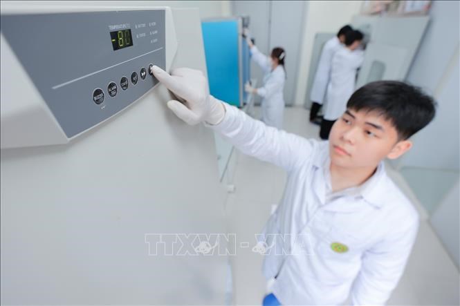 | Sinh viên thực hành lưu trữ vi khuẩn trong tủ âm sâu (-80°C), tiếp cận thiết bị hiện đại theo định hướng đào tạo gắn với khoa học – công nghệ. Ảnh: Lê Đông - TTXVN |