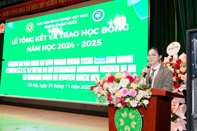 Sinh viên Ngô Ngọc Bảo Anh - lớp K66CNTYA đã thay mặt cho toàn thể sinh viên trong Khoa phát biểu cảm ơn các doanh nghiệp đã hỗ trợ các suất học bổng cho sinh viên của Khoa Chăn nuôi. Em bày tỏ lòng biết ơn đến các thầy cô và các nhà tài trợ đã đồng hành hỗ trợ sinh viên trong Khoa, đồng thời hứa sẽ tiếp tục phấn đấu để xứng đáng với niềm tin và kỳ vọng thầy cô.