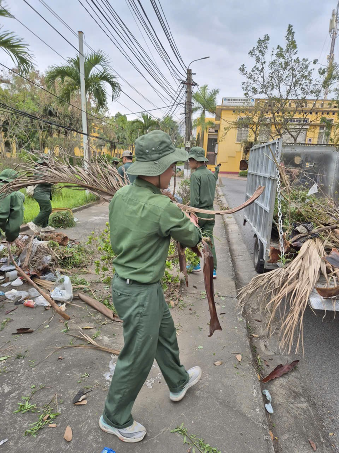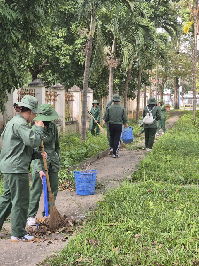 | Cán bộ, sinh viên tình nguyện tích cực dọn dẹp vệ sinh xung quanh khu vực Ký túc xá |